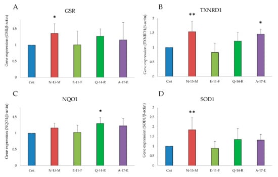 Antioxidant enzymes gene expression analysis. The gene expression of glutathione reductase (GRS, A), thioredoxin reductase (TXNRD1, B), NADPH quinone oxidoreductase (NQO1, C) and superoxide dismutase (SOD1, D) was evaluated in cDNA obtained from Caco-2 cells treated with N-15-M, E-11-F, Q-14-R and A-17-E (0.05 mg/mL) for 24 h. β-actin was used as reference. Means of at least four experiments were compared with the control. (** p < 0.01, * p < 0.05).