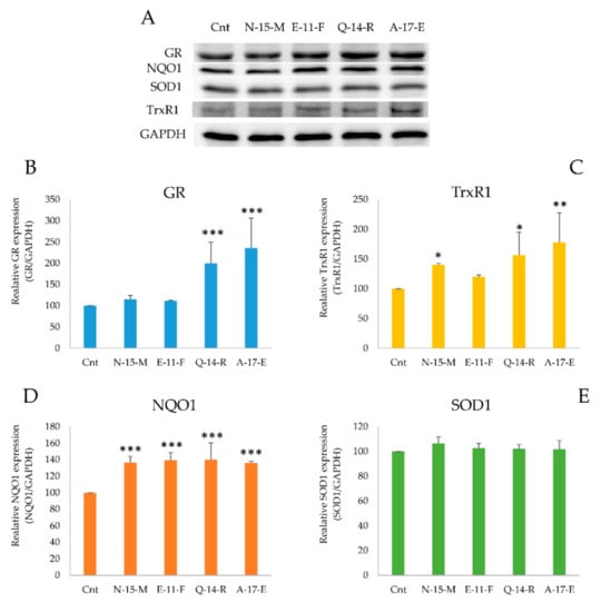 In order to confirm the observation regarding the increase of gene expression induced by N-15-M, Q-14-R and A-17-E, western blot analysis of lysates of cells treated with the four peptides was performed. Cells (5 × 105) were incubated in the presence of the four peptides (0.05 mg/mL) for 24 h. Aliquots of the samples (30 µg) were subjected to WB to detect glutathione reductase (GR), NADPH quinone oxidoreductase (NQO1), superoxide dismutase (SOD1) and thioredoxin reductase 1 (TrxR1). As shown in Figure 5, the most active peptides enhanced also the protein levels of these enzymes. In particular, cells treated with Q-14-R and A-17-E showed a large increase of GR, TrxR1 and NQO1 protein levels (Figure 5).
