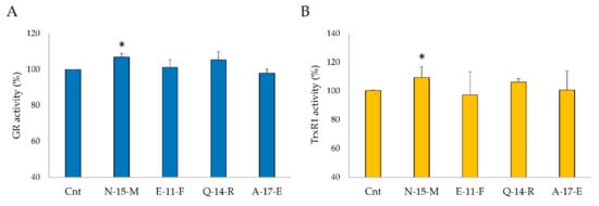 The activities of TrxR1 and GR in cells treated with N-15-M, E-11-F, Q-14-R and A-17-E were also analyzed. Cells were incubated with the indicated peptides in the same conditions as described above and 50 µg of protein cell lysates were used to determine TrxR1 activity by following DTNB reduction at 412 nm and NADPH oxidation at 340 nm for GR. As showed in Figure 6, a slight increase of the activities of the two antioxidant enzymes was observed in cells treated with N-15-M and Q-14-R.