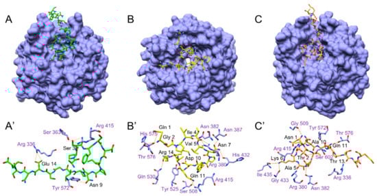 In order to get a prediction of the interaction of the Kelch domain of Keap1 with N-15-M, E-11-F, Q-14-R and A-17-E, docking simulation was performed (Figure 7). The free energy of dissociation of the assemblies calculated after a simulation of 50 ns showed that peptide E-11-F has no binding affinity with the target protein. On the contrary, peptides A-17-E, Q-14-R and N-15-M formed stable assemblies with the Kelch domain of Keap1. More in details, the first Serine (Ser 3) of A-17-E formed hydrogen bonds with a serine (Ser 363) and an arginine (Arg 415), the first A-17-E asparagine (Asn 9) formed a hydrogen bond with a tyrosine (Tyr 572) and the inner glutamic acid (Glu 14) formed hydrogen bonds with another arginine (Arg 336) (Figure 7A’). The Q-14-R peptide formed hydrogen bonds between its backbone and asparagine (Asn 382), arginine (Arg 380), glutamine (Gln 530), threonine (Thr 576) and histidine (His 575) of the Keap1 pocket; there were also hydrogen bonds between the asparagine (Asn 7) of the peptide and asparagine (Asn 387), arginine (Arg 380) and histidine (His 432) of Kelch domain, the aspartic acid (Asp 10) formed a hydrogen bond with a tyrosine (Tyr 525) and the inner glutamine of the peptide (Gln 11) formed hydrogen bonds with an arginine (Arg 415) and a serine (Ser 508) (Figure 7B’). The backbone of the N-15-M formed hydrogen bonds with an asparagine (Asn 382) a glycine (Gly 509), a tyrosine (Tyr 572) and three arginines (Arg 336, Arg 380, Arg 415); the first threonine of the peptide (Thr 2) formed a hydrogen bond with a Serine (Ser 602), the lysine (Lys 6) of the peptide form hydrogen bonds with a glycine (Gly 433) and an isoleucine (Ile 435), the glutamine of the peptide (Gln 11) formed a hydrogen bond with a threonine (Thr 576) (Figure 7C’). It is crucial to notice that there is a certain recurrence among the residues of the Kelch domain involved in the interaction with the peptides. Moreover, these residues are also implicated in the interaction between Kelch domain and Nrf2 [37] (Table 4).