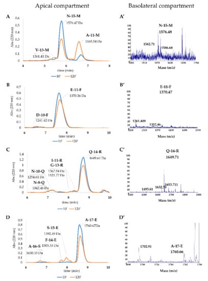 Uptake of the peptides by Caco-2 cells monolayer and their detection in AP and BL compartments. Each peptide (75 µg) was administered to the monolayer cells and samples of AP and BL were collected at the indicated time. (A–D) RP-HPLC chromatograms of the four peptides in the apical compartment at 10 and 120 min. (A’–D’) MS analysis of the peptides present in the basolateral side after 120 min.