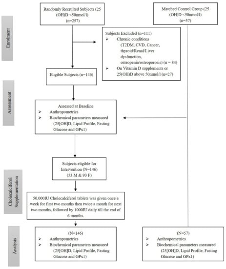 In this 6-month interventional study, a total of 257 adult Saudis aged 30–60 years, with vitamin D deficiency [25(OH)D < 50 nmol/L], were randomly selected from the Vitamin D Database of the Chair for Biomarkers of Chronic Diseases (CBCD), King Saud University (KSU), Riyadh, Kingdom of Saudi Arabia (KSA) and were assigned in the intervention group. A separate group of 57 adult Saudis (age- and BMI-matched) with vitamin D deficiency were also selected from the database. Briefly, this database was based on a capital-wide, multi-centre observational study done in primary health care centres (PHCCs) in Riyadh, Saudi Arabia, [,]. Written informed consents were obtained prior to inclusion in the study. Ethical approval was obtained from the Institutional Review Board (IRB) of King Saud Medical City (E-15-1667), Riyadh, Saudi Arabia. Participants answered a questionnaire that included demographic information, present and past medical history.