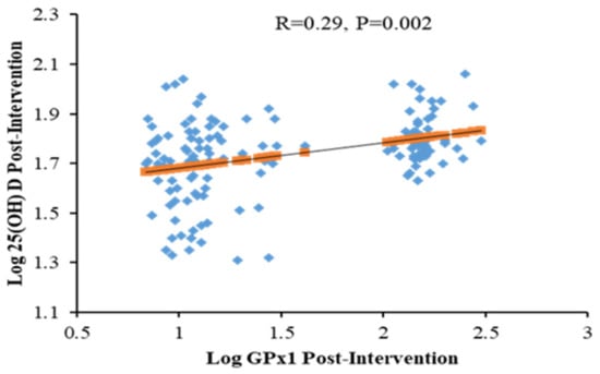 Relationship between Log 25(OH) D and GPx1 in all participants (Post-intervention).