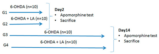 Forty male Wistar rats (220–260 g) were obtained from the vivarium of the Medical University of Sofia and housed under standard laboratory conditions (22 °C room temperature, 12 h light/12 h dark cycle), with ad libitum access to water and standard rat pellet diet. The experiment started one week after the habituation of the animals. At day one, all rats were randomly and equally distributed to four groups from G1 to G4, and all received a unilateral intrastriatal injection of 6-OHDA. The rats from the G2 and G4 groups received LA 35 mg/kg, i.p., dissolved in 1% Tween-80 solution daily, from the start to the end of the experiment. On day 2, the animals from G1 and G2 were subjected to an apomorphine test. After that, they were sacrificed with total brain removal for further evaluation. The same was done on day 14 of the experiment with the remaining rats from G3 and G4 groups. The flowchart of the study is presented in Figure 1.