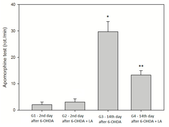 From another experiment, it was reported that 6-OHDA induced high levels of OS and strongly upregulated autophagy and neurodegeneration [45]. In our experiment, we demonstrated a statistically significantly elevated level of lipid peroxidation (TBARS), and a decreased GPx activity 14 days after the 6-OHDA, which is suggestive of 6-OHDA toxicity. GPx is susceptible to inactivation by its substrates [46]. This fact could explain why on day 14 of our experiment, we observed significantly lower GPx activity in the 6-OHDA treated rats, which did not receive LA.