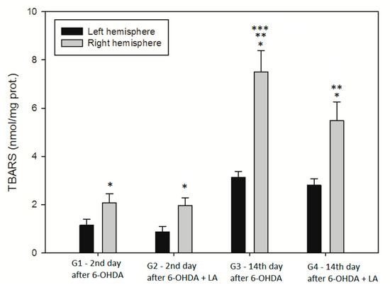Within each group, the TBARS values differed statistically significantly between the left and the right hemispheres, indicating that the 6-OHDA generated higher lipid peroxidation where it was applied compared to the contralateral hemisphere. Statistically significantly higher TBARS levels were found in both groups, evaluated on day 14 of the experiment (G3 and G4), as compared with earlier on day 2 of the experiment (G1 and G2). The TBARS level in the group with LA chronical treatment (G4) was statistically significantly lower than the group without LA treatment (G3).