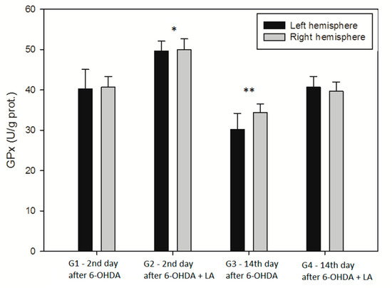 Statistically significantly higher GPx activity, as compared with the other three groups, was recorded in the group G2, i.e., LA-supplemented and evaluated on day 2 of the experiment. Statistically significantly lower GPx activity, as compared with the other three groups, was recorded in the group G3, i.e., on day 14 of the 6-OHDA application, without LA supplementation.
