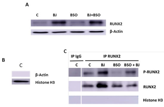 RUNX-2 is an important transcription factor for the activation of osteoblast differentiation and for regulation of bone remodeling, and it is involved in many bone diseases [44,45]. Figure 3A shows that BJ containing 15 μg∙mL−1 TSP was able to upregulate RUNX-2 levels, whereas no change was detected in cells treated with BSO only. RUNX-2 activation was evaluated by immunoprecipitation of equal amounts of nuclear proteins using anti-RUNX-2 antibody. The purification of the nuclear fraction was observed in control cells by Western blot, which revealed the presence of the histone H3 protein and not β-actin (Figure 3B). Figure 3C shows the absence of RUNX-2 or P-RUNX-2 or histone H3 bands in Western blot analysis of immunoprecipitates performed with IgG (negative control) in control cells; unlike RUNX-2 or P-RUNX-2 bands, no Histone H3 bands were detected after immunoprecipitation with anti-RUNX-2 (Figure 3). These data demonstrate the absence of non-specific bands under these experimental conditions. Figure 3C also shows that BJ containing 15 μg∙mL−1 TSP increased RUNX-2 nuclear levels and its phosphorylation as compared to control. On the other hand, decreases in RUNX-2 phosphorylation and no change in its nuclear levels were observed in cells treated with BSO, whereas RUNX-2 phosphorylation appeared to be restored by simultaneous treatment with BJ. Overall, these findings indicate that BJ was able to increase RUNX-2 and ALP activation, in normal redox state conditions, as well as prevent the inhibition of these factors in BSO-induced oxidative stress.
