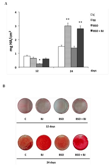The mineralization process was studied in cells treated or not (control) with BJ containing 15 μg∙mL−1 TSP or with BSO or BJ + BSO. Calcium deposition was measured 12 and 24 days after the induction of differentiation by staining with Alizarin Red S (Figure 4A).