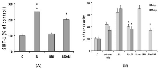 BJ effect on sirtuin type 1 (SIRT1) expression and SIRT1 inhibition role in BJ-induced ALP activation during differentiation of SaOS-2 cells. SIRT-1 expression (A) and ALP activity (B) were detected in SaOS-2 cells treated or not with BJ at 15 μg·mL−1 total soluble polyphenols (TSP) or BSO, BSO + BJ, or BJ + EX527, for one day in growth medium (GM) and, subsequently, in osteogenic medium (OM), in the presence or not of various treatments, as reported in Section 2. SIRT1 expression was detected after six days in OM by ELISA kit according to the manufacturer’s instructions, and levels are expressed as a percentage of the C values (A). ALP activity was also detected after two and 10 days in GM (control, C) and OM, as well as in transfected SIRT1 small interfering RNA (siRNA) or Scr RNA cells after two days in OM. SIRT1 expression and ALP activity values are expressed as a percentage of the respective C values, and they are the means ± SEM of three independent experiments; * p ≤ 0.05 compared to C cells; ○ p ≤ 0.05 compared to BJ-treated cells.