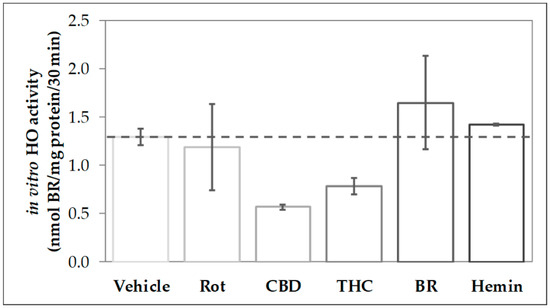 The reduced heme converting capacity in the presence of CBs might be the consequence of direct interaction with the enzyme in analogy to the (previously described) inhibition of cytochrome P450 isoenzymes in-vitro by CBD [67,68,69]. We, therefore, checked whether CBs are able to interfere with the HO reaction in-vitro directly. CBs were added straight to the assay performed with homogenates of neuroblastoma cells (N18TG2). The resulting HO activity was compared to the vehicle-treated control reaction. Both, CBD and to a much lesser degree THC, inhibited the in-vitro HO activity. This inhibition was not restricted to neuronal cells but was also found in homogenates from other cell types, such as liver tissue and macrophages (Figure 2).