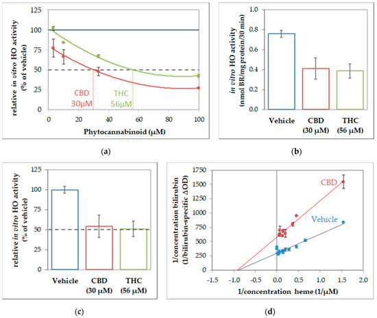 To further characterize the interaction of CBs and HO, we next determined the enzyme kinetics in the absence and presence of CBs to characterize the inhibition mode. Given that CBs specifically inhibited HO activity in all investigated tissue material, we supposed that the inhibition mode of CBs should be independent of the cell type. Therefore, we used macrophages of the J774A.1 cell line for enzyme kinetic experiments, because this cell type showed the highest HO activity from all tissue material investigated, and is thus best suited for studying enzyme inhibition. First, we determined the IC50 of CBD and THC by using the dilution series of the respective CB (Figure 3). IC50 values of 30 µM for CBD and 56 µM for THC (Figure 3a) were calculated from the obtained dose-response curves by polynomial regression. We then verified that the calculated IC50 is indeed leading to an inhibition of 50% compared to the not-inhibited vehicle control, and found our calculation confirmed (Figure 3b,c). The type of inhibition was investigated for the more potent CB, CBD. We determined HO activity at increasing concentrations of the substrate hemin in the presence or absence of CBD at IC50 concentration. The product formation was displayed against the hemin amount in a double reciprocal fashion as the Lineweaver-Burk plot. The mode of inhibition exerted by CBD was found to be non-competitive (Figure 3d).