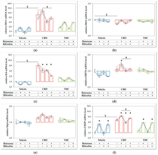 Rotenone and cannabidiol act synergistically in eliciting a stress response. N18TG2 cells were seeded 2 h before experiment and treated with vehicle, cannabidiol (CBD; 10 µM) or tetrahydrocannabinol (THC; 10 µM) alone and in combination with rotenone (Rot; 80 nm) or BR (10 µM) for 16 h. Gene expression levels of (a) the inducible isoform of heme oxygenase (HO-1), (b) the constitutive isoform of HO (HO-2), (c) interleukin 6 (IL6), (d) glucose-regulated protein 78 (GRP78), (e) X-box protein 1 (Xbp1), and (f) the pro-apoptotic marker C/EBP homologous protein (CHOP) were determined by reverse transcription-quantitative PCR, normalized to the internal reference gene Cyclophilin. Data are shown as both individual values and mean ± SEM of three biological replicates (n = 3) and are displayed relative to the untreated control condition (vehicle control), which was set to 1. The obtained data are displayed on a logarithmic scale with the base of 2. One-way ANOVA, followed by Bonferroni was performed to calculate the differences between groups. Values of p ≤ 0.05 were considered significant, and the following symbols indicate significant differences to the vehicle control group (§), to the respective control group (*), and between the condition with added Rot vs. Rot + BR (#). Exact p values for the group comparisons are shown in the supplementary material (Table S6).