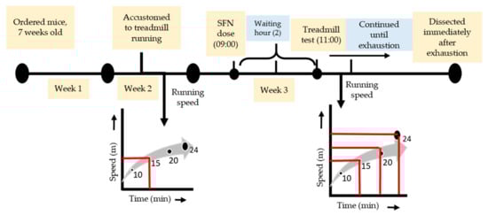 One week before the exhaustive running exercise, all mice (including sedentary) were accustomed to a motorized treadmill (Natsume, Kyoto, Japan) running at 15 m/min for 10 min (0% incline). SFN (LKT Laboratories, St. Paul, MN, USA, product code S8044) was administered orally (50 mg/kg body wt), solubilized in distilled water with a volume of 150 µL on the day of the experiment at around 9 am. The uphill treadmill running (7% incline) was started 2 h after feeding. The dose and waiting hours were selected based on the previous literature [37,38]. The Ex and SFN + Ex groups of mice were subjected to run at 15 m/min for 10 min, followed by 20 m/min for 10 min, and finally, 24 m/min continued until exhaustion (Figure 1). The state of exhaustion was defined as the inability to continue running despite tapping on the back of the mouse several times or repositioning by hand on the treadmill [39,40].