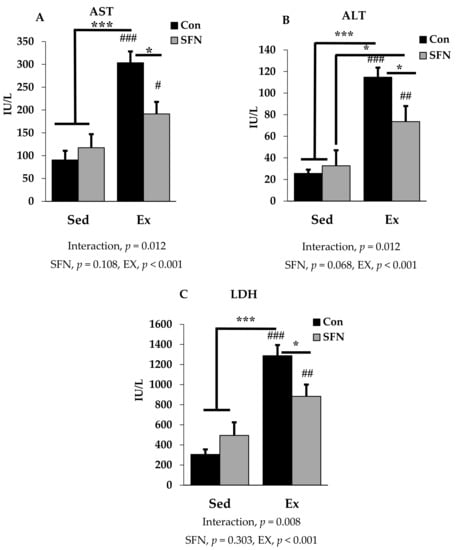 Plasma enzyme level comparison between the sedentary (Sed) and exercise (Ex) groups, with (sulforaphane; SFN) or without (control; Con) supplement. Figure 2 (A–C) represent aspartate aminotransferase (AST); alanine aminotransferase (ALT) and lactate dehydrogenase (LDH) levels in plasma. ### p < 0.001, ## p < 0.01, # p < 0.05 as compared to the sedentary control. *** p < 0.001, * p < 0.05. Interaction of SFN and Ex written as “Interaction”. Data are presented as mean ± SE.