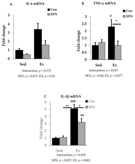 Interleukin-6 (IL-6) mRNA (A), Tumor necrosis factor-α (TNF-α) mRNA (B), and Interleukin-1β (IL-1β) mRNA (C) expression in the comparison between the sedentary (Sed) and exercise (Ex) groups, with (sulforaphane; SFN) or without (control; Con) supplement. ### p < 0.001, ## p < 0.01, # p < 0.05 as compared to the sedentary control. ** p < 0.01, * p < 0.05. Interaction of SFN and Ex written as “Interaction”. Data are presented as mean ± SE.