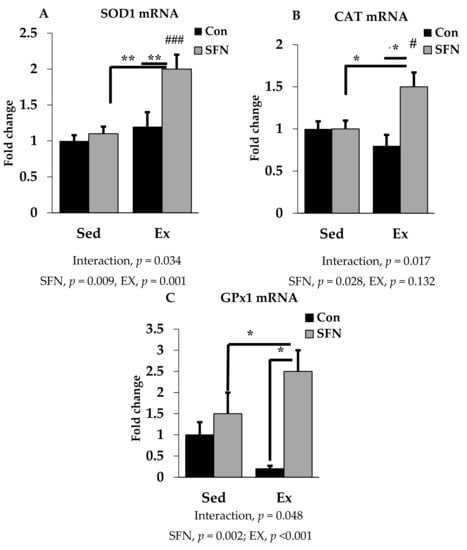 Superoxide dismutase 1 (SOD1) mRNA (A), Catalase (CAT) mRNA (B), and Glutathione peroxidase 1 (GPx1) mRNA (C) expression in the liver in the comparison between the sedentary (Sed) and exercise (Ex) groups, with (sulforaphane; SFN) or without (control; Con) supplement. ### p < 0.001, # p < 0.05 as compared to the sedentary control. ** p < 0.01, * p < 0.05. Interaction of SFN and Ex written as “Interaction”. Data are presented as mean ± SE.