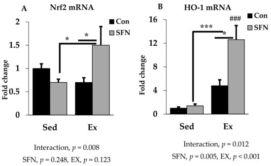 Nrf2 is the pivotal transcription factor for regulating the cellular antioxidant system. In Figure 5A, Nrf2 mRNA expression was increased by 1.5-fold with SFN in the exercise group, which differs significantly as compared to the exercise and/or sedentary SFN groups. Interestingly, as shown in Figure 5B, phase 2 enzyme HO-1 gene expression was increased by 12.6-fold in the Ex + SFN group, which is around a three-times larger expression than the nonsupplement exercise group. In addition, the interaction effect of both expression levels was significant (p < 0.05).