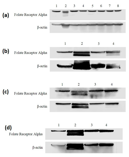 - Shen, F.; Ross, J.F.; Wang, X.; Ratnam, M. Identification of a novel folate receptor, a truncated receptor, and receptor type. beta. in hematopoietic cells: cDNA cloning, expression, immunoreactivity, and tissue specificity. Biochemistry 1994, 33, 1209–1215. [Google Scholar] [CrossRef] [PubMed]