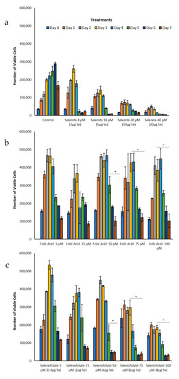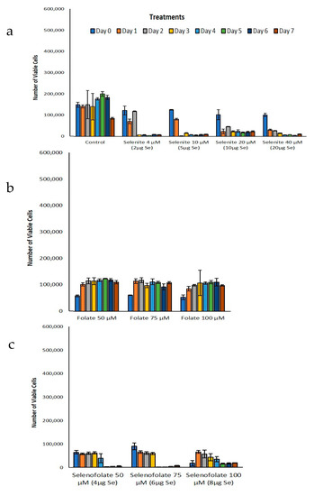 Control and treated cell viability were determined by Trypan Blue exclusion on a Beckman Coulter Vi-Cell Viability Analyzer (Beckman Coulter, Inc. Model VI-CELL SGL, Indianapolis, IN, USA). Trypan Blue determines the integrity of the plasma membrane. Cells with unperturbed membranes (and thus clear of the dye) are considered viable. Forty-thousand cells/well were seeded in 48-well flat-bottom plates. Cell volumes were adjusted with media and the cells were cultured for 5 days prior to treatments. Media was changed on day 3 post-seeding. Cells were treated with PBS alone while 5–100 µM of either Folic Acid or Selenofolate treated cells in triplicates over assayed over 7 days. Control cells were treated with 4, 10, 20 and 40 µM (2–20 µg Se) of selenite.
