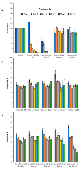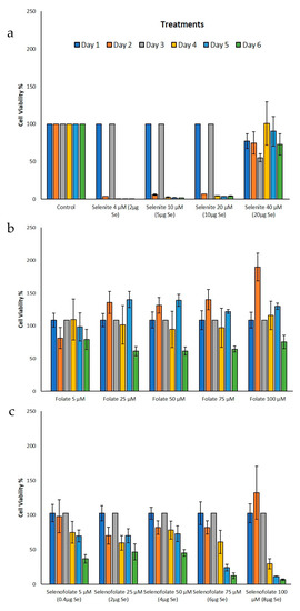 Analysis of treatment cytotoxicity in HME50-5E cells. Cytotoxic effects of (a) control and selenite, (b) Folic Acid, (c) Selenofolate treatments against HME50-5E cells was determined as a function of percent cell viability. Forty-thousand cells were seeded and treated as shown (Day 0 = start of treatment) with 5 μM, 25 μM, 50 μM, 75 μM and 100 μM Folic acid and Selenofolate with Se equivalents of 0.4 μg, 2 μg, 4 μg, 6 μg, and 8 μg respectively. Viable cells were counted and analyzed by Trypan Blue exclusion every 24 h for 7 days. The data are expressed as mean ± SE (n = 3). Statistical treatments were compared using two sample t-tests. Treatments that were statistically significant, p ≤ 0.05 are summarized in Table 2. Note: Many HME50-5E cells remained adherent to the plate and thus could not be accurately analyzed.