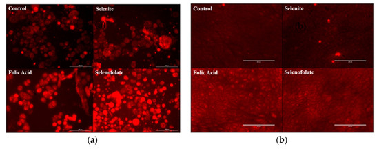 Photomicrographs of intracellular superoxide generation by Dihydroethidium (DHE) red florescence. (a) MDA-MB-468 Cells (left panels) with scale bar at 100 µm. (b) HME50-5E cells (right panels) with scale bar at 200 µm. Results were photographed after 30 min of treatment with untreated control, 20 µM selenite (10 µg Se), 100 µM Folic Acid and 100 µM Selenofolate (8 µg Se).