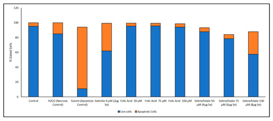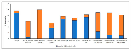 Cells were seeded at 40,000 cells/well into 48-well, flat-bottom plates and cultured for 5 days prior to commencement of treatment. Media was changed on day 3. On day 5 post seeding, cells were treated with 50, 75 and 100 µM of Folic Acid or Selenofolate and incubated for 3-days, post-treatment. Control cells were treated similarly, but without Folic Acid or Selenofolate. Control cells were treated with 4 µM/well (2 µg Se) as selenite. To induce necrosis, cells were treated with 50 µL of 0.01% Triton X-100 for 30 min or with 200 µL of H2O2 for 24 h, prior to staining. Single stained controls were treated with Annexin V–488 and the apoptosis inducer Sutent (5 µL of 1 mM solution). Double stained controls cells were treated with the same volume of both dyes. These controls were retained in 2 mL Eppendorf tubes. All treatments and analyses were performed in triplicate.