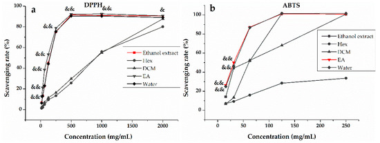 The scavenging rate (%) of the ethanol extract, n-hexane (Hex), dichloromethane (DCM), ethyl acetate (EA), and water fractions of H. abyssinica: (a) the radical scavenging rate (%) of 2,2-diphenyl-1-picrylhydrazyl (DPPH) and (b) the radical scavenging rate (%) of 2,2′-azino-bis(3-ethylbenzthiazoline-6-sulfonic acid (ABTS). All of the values in the figure are expressed as means (%) and SD of triplicated experiments. & p < 0.05, && p < 0.01, compared with the ethanol extract.