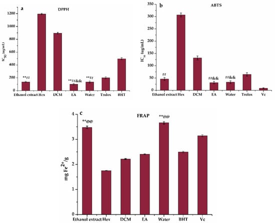 Antioxidant activity of the ethanol extract, n-hexane (Hex), dichloromethane (DCM), ethyl acetate (EA) and water fractions of H. abyssinica: (a) The IC50 value of 2,2-diphenyl-1-picrylhydrazyl (DPPH) radical scavenging assay, (b) The IC50 value of 2,2′-azino-bis(3-ethylbenzthiazoline-6-sulfonic acid (ABTS) radical scavenging assay, and (c) ferric-ion reducing antioxidant power (FRAP) assay. ## p < 0.01, ** p < 0.01, @@ p < 0.01, and && p < 0.01, as compared with the positive controls Trolox, BHT, Vc, and ethanol extract, respectively.