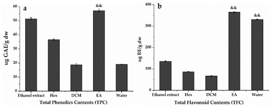 (a)Total phenolics contents (TPC) and (b) total flavonoids contents (TFC) of H. abyssinica. GAE/g dw: gallic acid equivalent per gram of dry weight; RE/g dw: rutin equivalent per gram of dry weight. && p < 0.01, as compared with the ethanol extract.
