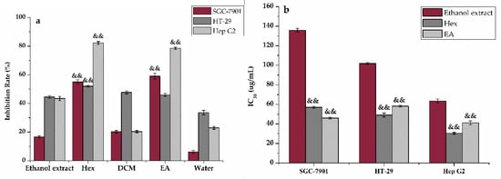 Anti-proliferative activity of the ethanol extract, Hex, DCM, EA, and water fractions of H. abyssinica: (a) The inhibition ratio of SGC-7901, HT-29, and HepG2 cells treated by the ethanol extract, Hex, DCM, EA, and water fractions of H. abyssinica; and (b) The IC50 value of the ethanol extract, Hex, and EA. All of the values in the figure are expressed as means (%) and standard deviation of triplicate experiments. && p < 0.01, as compared with the ethanol extract.