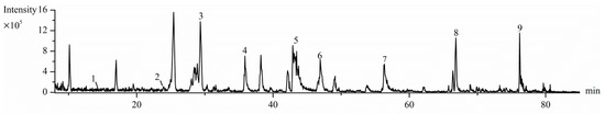 The LC-MS analysis was conducted on a TSQ Quantum Access MAX mass spectrometer coupled with an HPLC system (Thermo Accela 600, Thermo Fisher Scientific, San Jose, CA, USA). The conditions of HPLC were set as follows: 280 nm, ultrapure water (mobile phase A) and acetonitrile (mobile phase B); 5–10% B in 0–3 min, 10% B in 3–10 min, 10–30% B in 10–80 min, and 30–95% B in 80–120 min (Waters Symmetry RP-C18 column, 4.6 × 250 mm, 3.5 m, Waters, Milford, MA, USA); 37 °C; 10 µL (injection volume); and 0.6 mL/min (flow rate). The conditions for MS were the following: negative full scan and the data-dependent mode; 120 to 1000 (m/z); 3 kV (spray voltage); 350 °C (capillary temperature); 300 °C (vaporizer temperature).