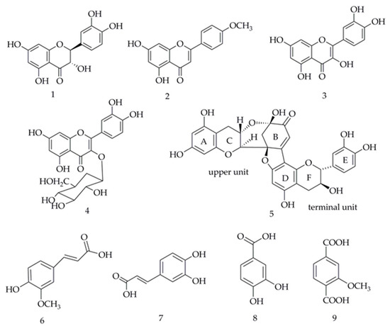 Phenols and flavones are usually suggested to be the major compounds with antioxidant capacity in plants [37]. The results of the TPC and TFC from H. abyssinica further showed that phenols and flavones were the main substances displaying antioxidant activity. Meanwhile, the EA fraction of H. abyssinica showed stronger antioxidant activity when compared with the other four samples, as seen in on Figure 2. At present, there is no report on the systematic separation of the EA fraction and only a few phenols and flavone compounds were reported from H. abyssinica. In this study, the EA fraction was firstly subjected to HPLC-UV/ESI-MS/MS analysis (Figure 5 and Table 1), then the specific antioxidants compounds were isolated and identified. As shown in Figure 6, five flavonoids and four phenolics, namely dihydroquercetin (1), acacetin (2), quercetin (3), isoquercitin (4), dehydrodicatechin A (5), trans-ferulic acid (6), caffeic acid (7), 3,4-dihydroxybenzoic acid (8), and 2-methoxyterephthalic acid (9), were separated from the EA fraction of H. abyssinica,. Their structures were elucidated based on NMR and other spectroscopic methods. Compounds 1–3, 5–7, and 9 were identified for the first time from H. abyssinica as well as from the Hagen genera.