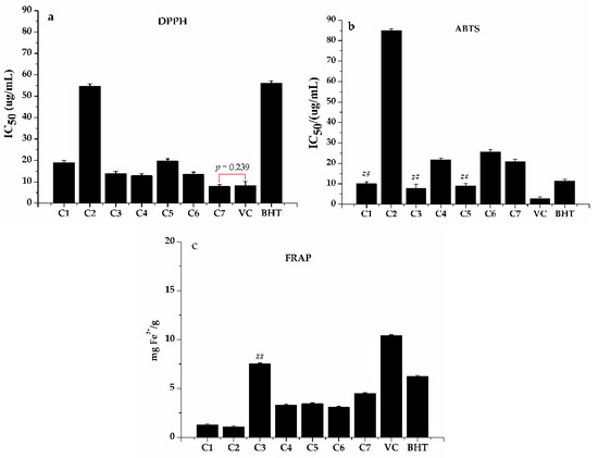 The antioxidant activity of compounds from the EA fraction, C1 = dihydroquercetin, C2 = acacetin, C3 = quercetin, C4 = isoquercitin, C5 = dehydrodicatechin A, C6 = trans-ferulic acid, and C7 = caffeic acid. (a) The IC50 value of DPPH radical scavenging assay, (b) The IC50 value of ABST radical scavenging assay, and (c) ferric-ion reducing antioxidant power (FRAP) assay. ## p < 0.01 compared with the positive control of BHT.