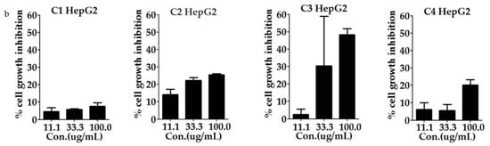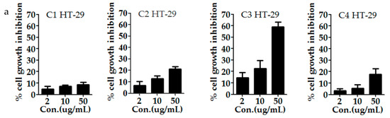 Anti-proliferative activity of some compounds from the EA fraction of H. abyssinica, C1 = dihydroquercetin, C2 = acacetin, C3 = quercetin, and C4 = isoquercitin. (a) The inhibition ratio of HT-29 treated by compounds C1–C4 of H. abyssinica. (b) The inhibition ratio of HepG2 treated by compounds C1–C4 of H. abyssinica. All of the values in the figure are expressed as means (%) and standard deviation of triplicated experiments.
