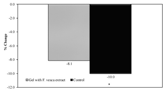 To evaluate the in vivo antioxidant activity, an analysis of the skin color was performed and compared to the first day of topical application of the products (D0) was performed. The color variation (b* parameter) in the control arm (10.0%) was significantly higher than the variation in the arm treated with hydrogel formulation containing F. vesca (8.1%). The difference between the variation was 1.9%. Figure 4 shows the values of b* parameter before and after UVA irradiation, in the control arm, and in the arm treated with hydrogel with F. vesca extract.