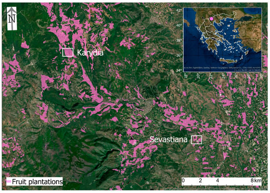The study area is situated in the regional unit of Pella, in the northern part of Greece, known for fruit production, such as peaches, apricots, apples, cherries, etc. Two sites with different environmental characteristics were targeted, as representative of the whole study area (Figure 1).