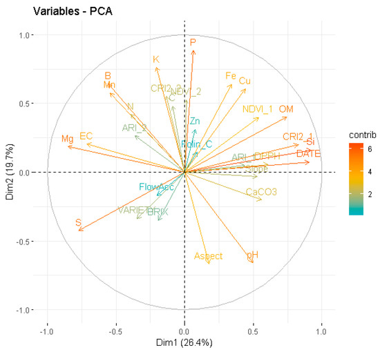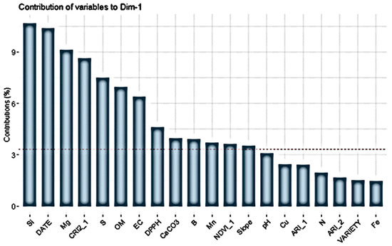 PCA revealed that high IC50 values in the DPPH assay (i.e., low antioxidant activity of fruits) are on the right side, which is represented by cherry trees having high NDVI and CRI2 levels and grown on soils having high Organic Matter (OM) content (Figure 4). The first principal component (PC1) presents positive high correlation in descending order with Si, Date, CRI2_1, OM, DPPH, CaCO3, NDVI_1 and slope, and negative high correlation in descending order with Mg, S, EC, B and Mn, as shown in the variable contribution plot (Figure 5).