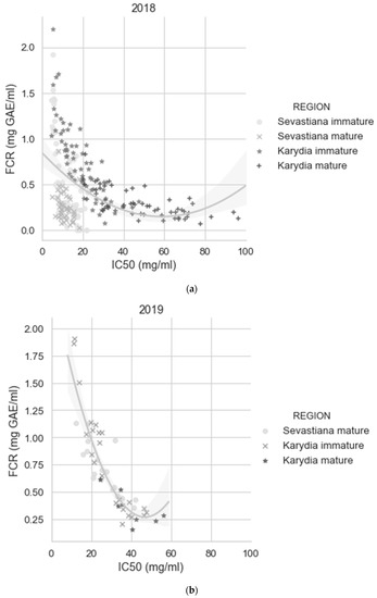 Relationships between DPPH and FCR for (a) 2018 (R2 = 0.21) and (b) 2019 (R2 = 0.81). Both graphs show that mature cherry fruits harvested at Karydia had higher than 20 mg/mL IC50 values for both 2018 and 2019.