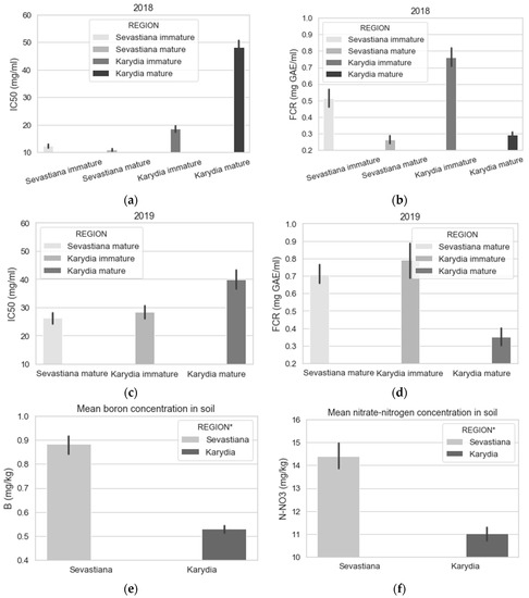 Mean IC50 values in the DPPH assay and total phenolic content (FCR) of immature and mature fruits for Sevastiana and Karydia in 2018 and 2019 (a–d). Mean soil boron and nitrate/nitrogen concentration for Sevastiana and Karydia (e,f).