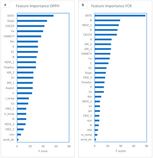The XGBoost variables importance for the remote sensing indices, soil attributes, climatic, topographic and hydrographic data of 2018 experimental season for the DPPH and FCR XGBoost models is presented in Figure 8. The FCRXGBoost model was trained just for the interpretation of variables effect on FCR, whereas the DPPH XGBoost model was trained for constructing a predictive model for the detection of cherry fruits having high antioxidant capacity. In general, from the remote sensing indices, the NDVI from the first UAS flight was the most important remote sensing index for both models followed by ARI. Interestingly a topographic variable (slope) was considered as the second most important variable from the XGBoost model with regards to the DPPH prediction. From Figure 8, it is evident that boron is equally important for both DPPH and FCR models.