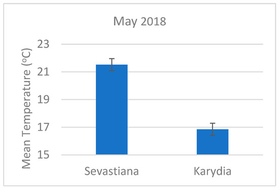 The higher FCR of Karydia immature harvested fruits can be attributed to the lower temperatures recorded for Karydia compared to Sevastiana. Figure 6 shows that for May the mean temperature was 27.7% higher for Sevastiana compared to Karydia. Temperature influences the development of phenolic compounds both at high and low temperatures (Sun et al. 2017). A reduction in these compounds at high temperatures can be due to temperature induced transcriptome changes regulating the biosynthetic pathway of phenolic compounds [72]. The mature fruits in Karydia were harvested in June, when probably the temperature effect was eliminated and thus mature fruits from Karydia and Sevastiana did not have significantly different FCR (Figure 4).
