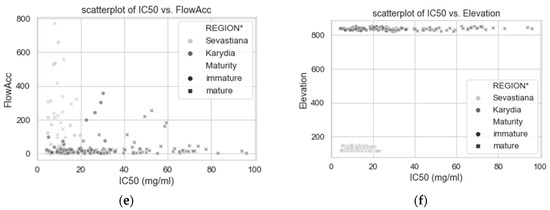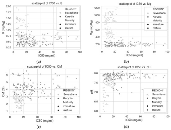 Scatter plots spotting data from Sevastiana area having low IC50 values in the DPPH assay at (a) specific levels of boron (B), (b) magnesium (Mg), (c) organic matter content (OM), (d) soil acidity (pH), (e) flow accumulation (FlowAcc) and (f) elevation.