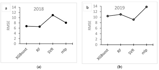 Figure 11 shows the performance of the models used for predicting DPPH. For 2018, the smaller RMSE and MAPE achieved were 6.74 and 15.06, respectively, using the XGBoost algorithm. For 2019, using the algorithms trained on the 2018 data, the smaller RMSE achieved was 9.12 using the SVR algorithm, and the smaller MAPE achieved was 28.07 using the XGBoost algorithm. As the MAPE accuracy measurement is less sensitive to the outliers, which is quite common for agricultural modelling data, as opposed to the RMSE, the XGBoost is finally selected as the best predictive algorithm for DPPH.