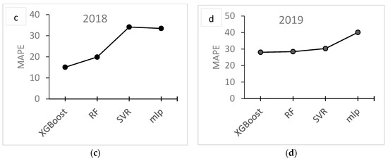Root mean square error (RMSE) (a,b) and mean absolute percentage error (c,d) of DPPH prediction using XGBoost, random forest (RF), support vector regression (SVR) and multiple perceptron (MLP) models for 2018 (a–c) and 2019 (b,d).