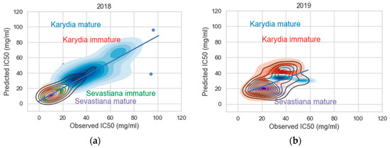 Kernel density plots showing the relationship between observed and predicted IC50 values in the DPPH assay using the XGBoost model for (a) 2018 and (b) 2019.