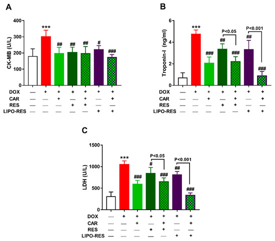 3.3. CAR, RES and LIPO-RES Prevent Oxidative Stress in the Heart of DOX-Intoxicated Rats