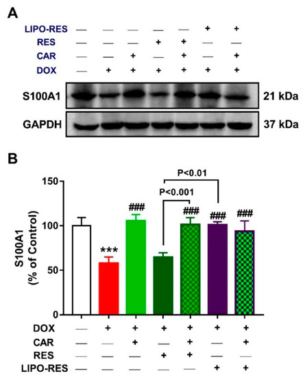 3.4. CAR, RES and LIPO-RES Upregulate Cardiac S100A1 and SERCA2a in DOX-Intoxicated Rats