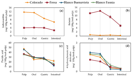 Bioactive content (mg/100 g fresh weight) in prickly pear pulps during in vitro simulated gastrointestinal digestion. (a) indicaxanthin, (b) betanin, (c) piscidic acid, and (d) 4-hydroxybenzoic acid derivative.