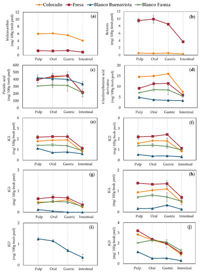 Bioactive content (mg/100 g fresh weight) in prickly pear peels during in vitro simulated gastrointestinal digestion. (a) indicaxanthin, (b) betanin, (c) piscidic acid, and (d) 4-hydroxybenzoic acid derivative, (e) isorhamnetin glucosyl-rhamnosyl-rhamnoside (IG1), (f) isorhamnetin glucosyl-rhamnosyl-pentoside (IG2), (g) isorhamnetin hexosyl-hexosyl-pentoside (IG3), (h) isorhamnetin glucosyl-pentoside (IG4), (i) isorhamnetin hexosyl-rhamnoside (IG7), (j) isorhamnetin glucosyl-rhamnoside (IG5).